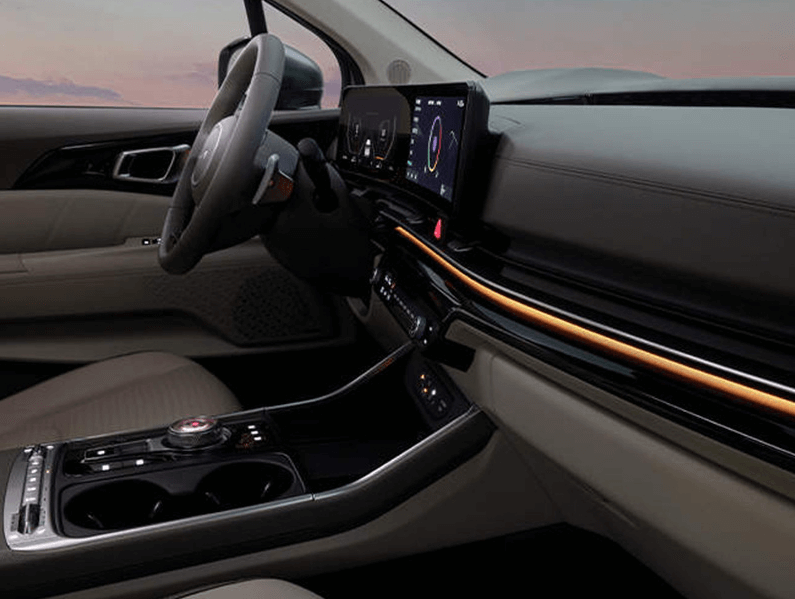 카니발의 실내는 고급스러운 디자인과 다양한 편의 사양으로 구성되어 있습니다. 전 트림 기본으로 탑재되는 12.3인치 디지털 계기판과 내비게이션은 시인성과 조작 편의성이 뛰어나며, 상위 트림에서는 BOSE 프리미엄 사운드 시스템, 듀얼 선루프, VIP 라운지 시트 등이 적용되어 고급 세단에 버금가는 만족도를 제공합니다.